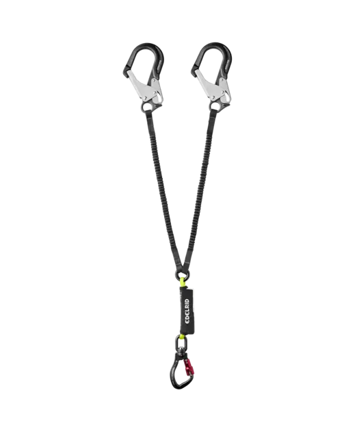 Y-lanyard with elasticated arms, an integrated shock absorber, and large aluminum palm carabiners. Ideal for use in the field of scaffolding as well as for securing to and moving along anchor points or structures and progressing on lifelines, including for passing protection. The shock absorber is designed for a high load capacity of up to 140 kg. The individual carabiners and the SHOCKSTOP-Y 140 GIANT ANSI as a system have been edge tested. The integrated swivel carabiner for harness attachment prevents the arms from twisting during use.