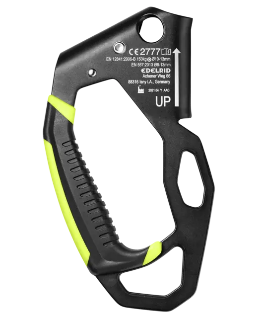 The upper part of the ascender can be grasped with the other hand for two-handed ascents