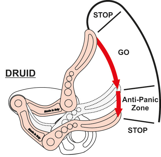A lightweight, compact auto-braking descender for rope access and rescue designed for semi-static ropes ranging from 10-11 mm. Anti-panic function in the lever re-engages the cam if the handle is pulled too far where it could lead to unsafe descent speeds. The body and lever are made of robust hot-forged aluminum alloy. Mechanical parts are made of precision-cast stainless steel. The internal mechanism and locking cam use a innovative design for smooth action on the rope which prevents rapid wear-and-tear and absorbs energy from small shocks with a slight amount of rope slippage. The fluid action on the rope also allows the Druid to function well for rope ascent. The cam can be de-activated with a trigger to allow quick sliding of the rope in situations with no load or limited load. Steel ring for attaching a keeper cord. Standards: - EN 12841/C as a descender of the working line for workers up to 120 kg; can also be used for rope access rescue up to 200 kg. - EN 341/2A as an emergency evacuation device on a single line for workers up to 120 kg, 11 mm semi-static rope (Lithium 11 mm). - EN 15151-1 for climbing structures using mountaineering techniques with dynamic ropes ranging from 9.9 to 11 mm.