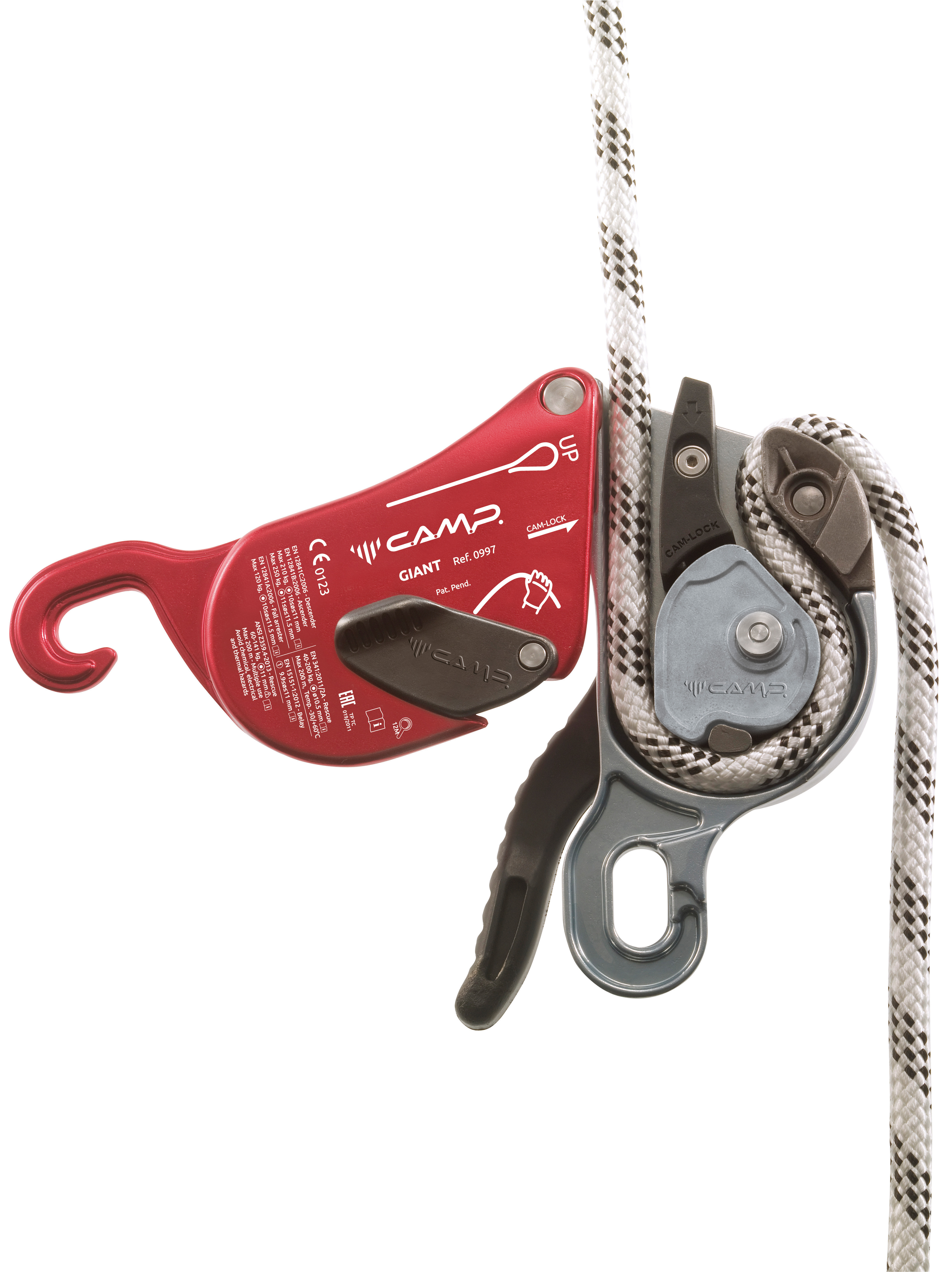 An innovative multifunctional descender developed to meet the demands of the most technical rope access and rescue specialists. The internal mechanism combines with robust hot-forged construction and advanced ergonomics for exceptional control even with heavy loads (up to 250 kg for two person scenarios). In addition to its primary function as a descender, the Giant is also certified for use as a fall arrest device (i.e. during rope transfers), as an ascender with smooth upward glide, and as a belay device for climbing, making it the most widely certified rope tool of its kind. The actuating lever features an anti-panic system that locks the rope and arrests the descent in case of excessive pressure on the lever by the user as well as an extra lock off position so the worker does not have to tie off the device. An external button can be used to hold the cam open allowing the rope to slide easily in situations with limited or no load. The device can be opened to insert or remove the rope without removing the carabiner (this helps prevent the possibility of dropping the device). The large attachment hole allows for the insertion of a second carabiner making the two plates unopenable. The logical circular rope path along with clear internal and external markings makes installation of the rope simple and intuitive. Standards: - EN 12841 as a rope access device for semi-static ropes ranging from 10 to 11.5 mm: - Type C: descender of the working line for loads up to 250 kg (from 11 to 11.5 mm) or 210 kg (from 10 to 10.9 mm); - Type B: ascender of the working line for loads up to 250 kg (from 11 to 11.5 mm) or 210 kg (from 10 to 10.9 mm); - Type A: fall arrester for the safety line for loads up to 120 kg. - EN 341/2A as a rescue and evacuation descender for 10.5 mm semi-static rope (Iridium 10.5 mm) for loads up to 200 kg. - ANSI/ASSE Z359.4 as a rescue and evacuation descender for 11 mm semi-static rope (Iridium 11 mm). - EN 15151-1 for climbing structures using mountaineering techniques with dyna