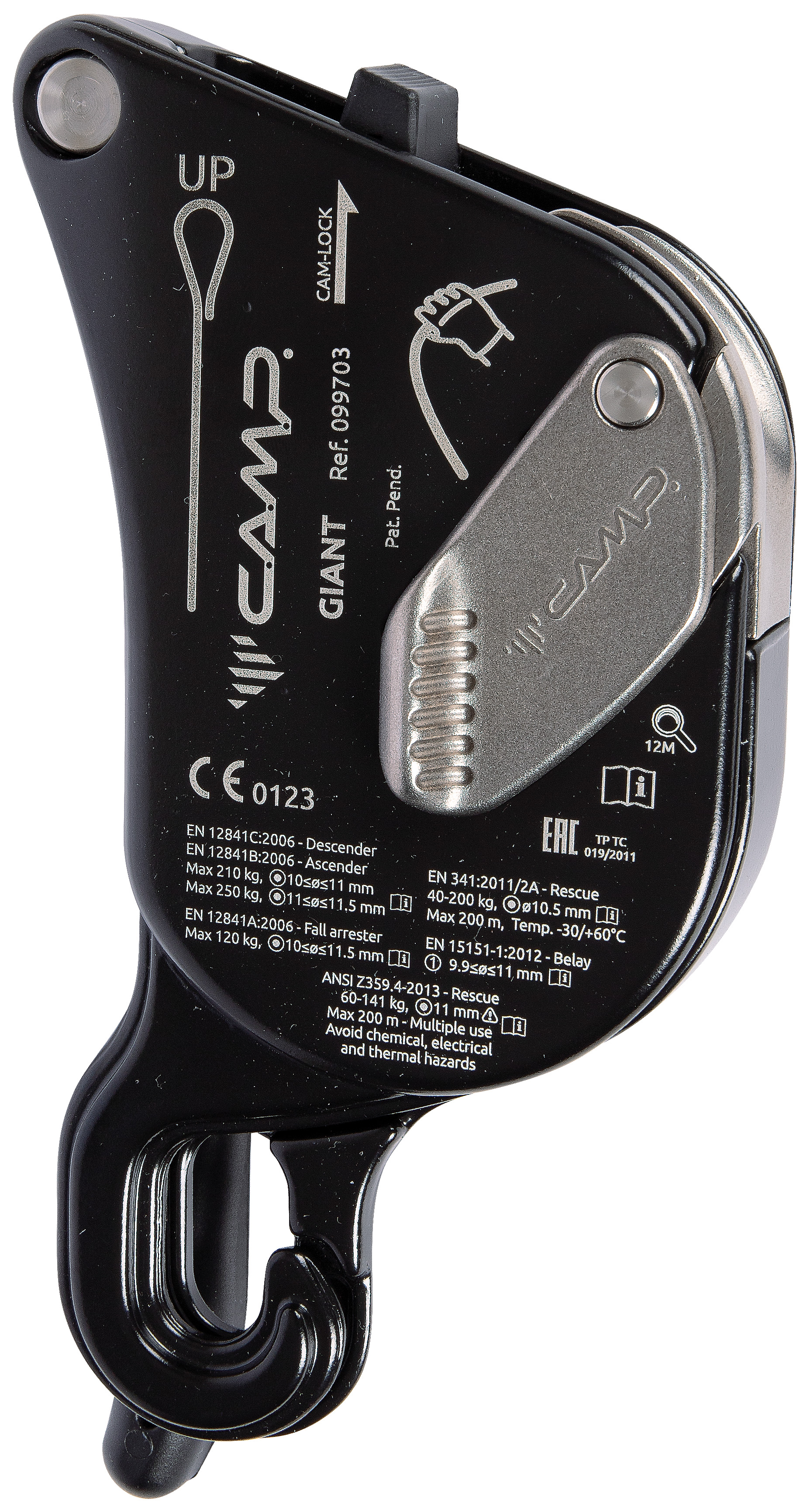 In addition to its primary function as a descender, the Giant is also certified for use as a fall arrest device (i.e. during rope transfers), as an ascender with smooth upward glide, and as a belay device for climbing, making it the most widely certified rope tool of its kind.