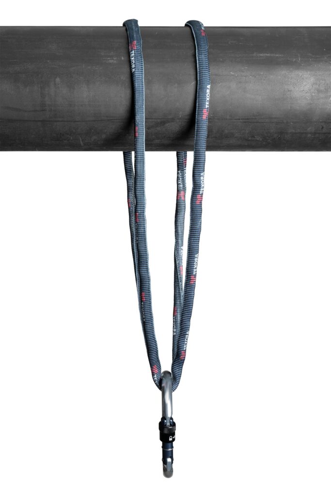Texora recommends using an approved carabiner to join two slings together. Follow best practices for properly loading carabiners.