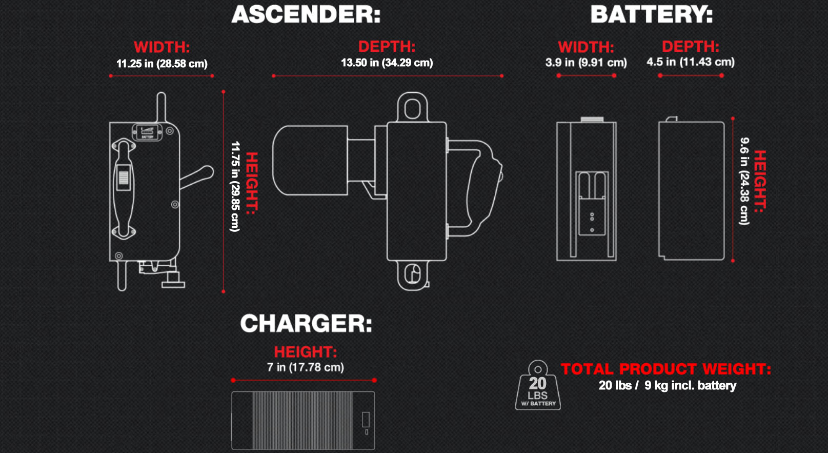 - 400 lbs. (181 kg) Safe Working Load - Variable Speed Control - (0.5 – 1.5 ft./sec) - Hands-Free Braking System - Gravity Feed Descent - Automatic End Feed Rope Loading - Safely Secures Rope inside the Lift & Prevents Accidental Detachment - Allows for Angled Ascents - Hot-Swappable Lithium Battery w/charge reading - Water Resistant IP54 Rating - Operating Temp. -4°F – 120 °F (-20 °C – +49 °C) - Battery Indicator Power Selector Switch - Allows for Battery Indicator Reading to be On or Off