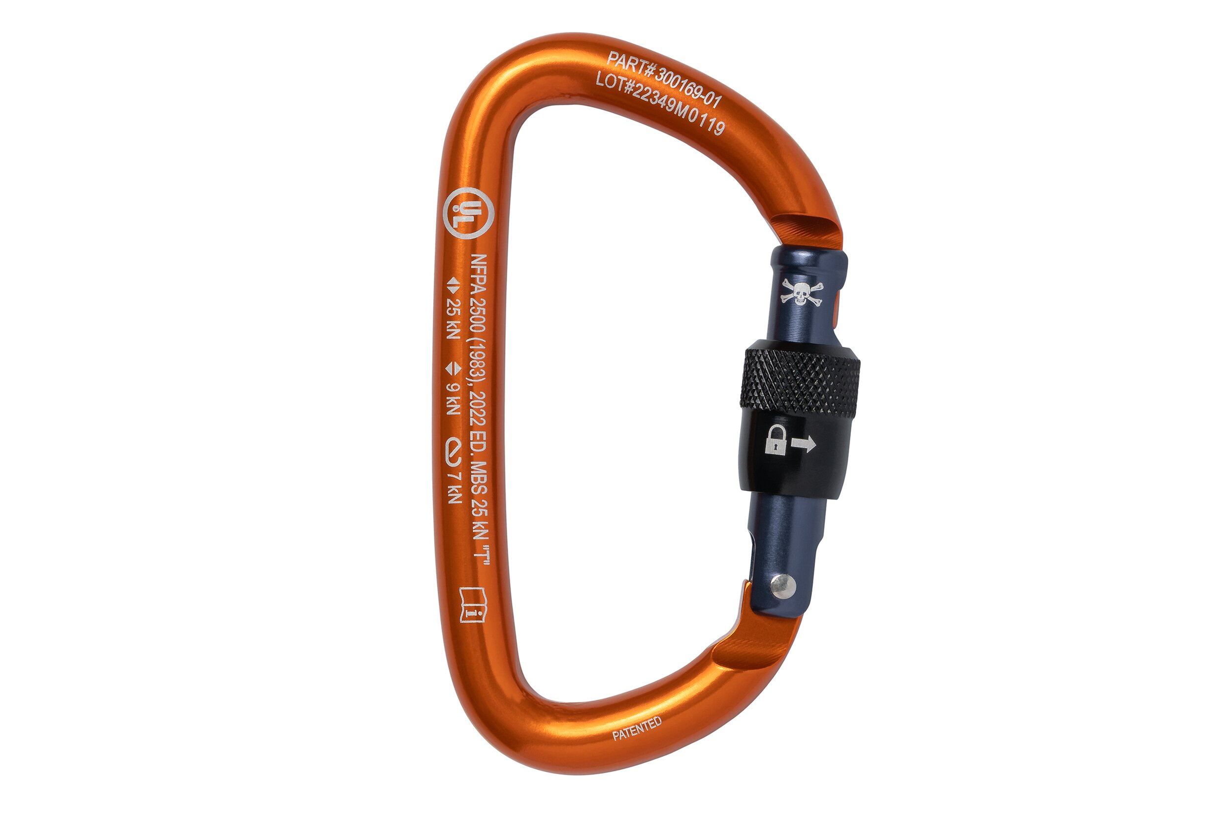 Ideal for rescue and rope access, this anodized carabiner’s patented key-lock design does not hang up when unclipping from your harness or web. An optimized D-shape maximizes its strength, and its wide gate opening fits over 1-inch (25-mm) diameter railings, unusual for a carabiner this compact and light. Safety indicators etched on the gate augment easy one-hand operation. Auto-Lock versions are available with a removable keeper pin for use with lanyards or for terminating escape or RIT lines. Every carabiner is proof loaded. Serial numbers on every carabiner.