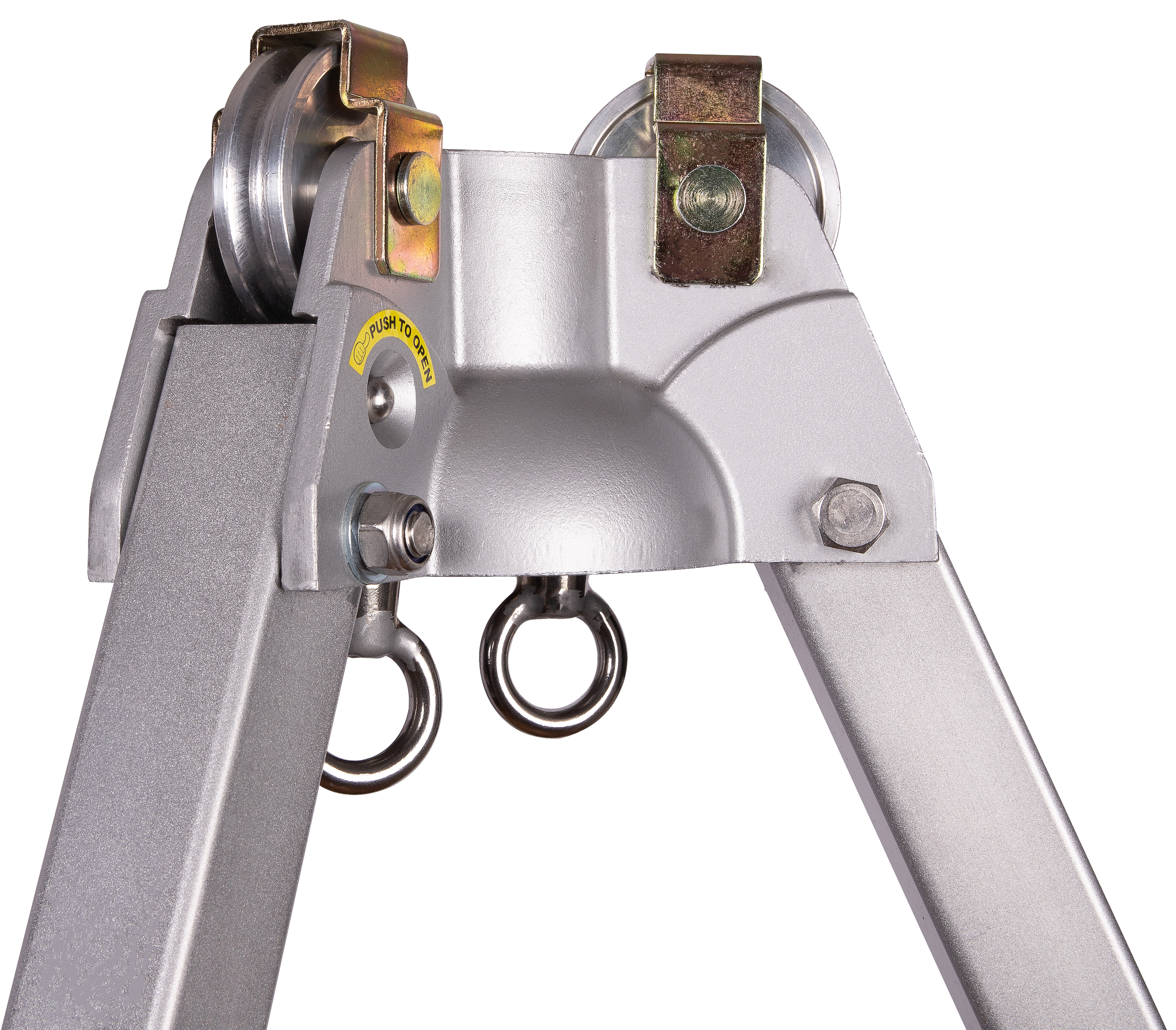 The head is equipped with two swiveling anchor points for fixing rope access adjustment devices and two pulleys that allow the combined and simultaneous use of a Tripos Lift rescue winch and a Cobra Lift self-retracting device with retrieval function (supplied separately).