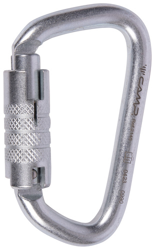 High strength steel carabiner. D shape makes it particularly good for use with knots.